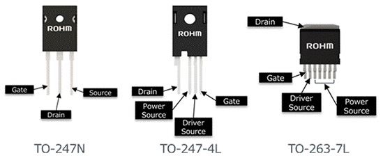 如“有驅動器源極引腳的封裝”一文中所述,具有驅動器源極引腳的TO-247-4L的引腳分配不同于傳統(tǒng)的TO-247N。在這里再次給出傳統(tǒng)TO-247N、有驅動器源極引腳的TO-247-4L以及TO-263-7L的引腳分配圖。