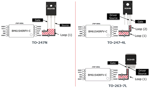 由于具有驅動器源極引腳的TO-247-4L封裝和不具有驅動器源極引腳的TO-247N封裝的引腳分配不同,因此在圖案布局時需要注意。