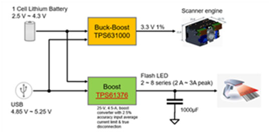 那么,升壓轉(zhuǎn)換器TPS61376是如何助力更高集成度條碼掃描器方案的呢?條碼掃描器通常會(huì)帶有大功率Flash LED用來(lái)做光線發(fā)射,它的瞬時(shí)電流是比較大的,根據(jù)用的LED數(shù)量不同一般2~3A甚至更大。而條碼掃描器的電源是USB或者電池,尤其是USB接口是承受不了這樣的瞬時(shí)大電流,所以通常在系統(tǒng)中加入一個(gè)緩沖電容,由這個(gè)緩沖電容來(lái)提供瞬時(shí)能量,此外,系統(tǒng)中還會(huì)在USB電源供電測(cè)加入限流保護(hù),避免瞬時(shí)大電流將USB電源拉死。同時(shí),電路中需要升壓電路將條碼掃描器的輸入升壓給Flash LED供電。下圖為條碼掃描器系統(tǒng)框圖。