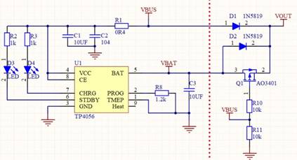 當VBUS處有外部電源輸入時,電流可以直接從二極管D1通過,流到VOUT輸出處;而此時由于VBUS同時也將PMOS管Q1的柵極拉高,使得柵極電壓與源極電壓相差很小,Q1管會截止,防止了VOUT處有電流流向VBAT。這樣實現(xiàn)了有外部電源VBUS時,外部電源為VOUT供電,而同時為VBAT電池充電。