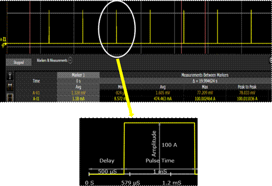 在對分流器測試過程中,為了避免持續(xù)大電流導致被測產(chǎn)品的溫升,APS先進電源系統(tǒng)輸出100A,1mS電流脈沖,通過設置占空比,平均電流僅僅474mA。如下圖: