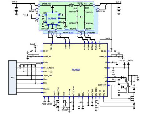 12 V 鉛酸電池,兩側(cè)是 48 V 鋰電池以啟動發(fā)動機(jī)。因此,需要根據(jù)整個系統(tǒng)的特定需求在兩個電池之間雙向傳輸電力。