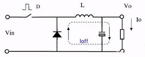 當開關(guān)關(guān)斷時:由于電感上的電流不能突變,電感中存儲的能量向負載釋放,電感電流通過二極管續(xù)流 ,在這個階段,電流波形是一條斜率為負的斜線。如下圖