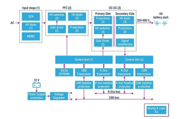 圖 2:電動(dòng)汽車(chē)電氣系統(tǒng)框圖。(來(lái)源:意法半導(dǎo)體)