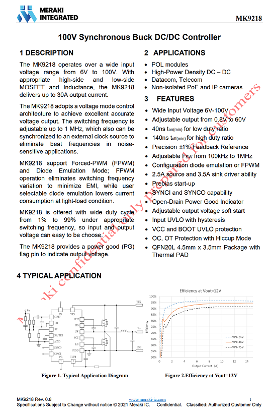 茂睿芯MK9218是一顆6-100V超寬輸入電壓的同步降壓轉(zhuǎn)換器,通過搭配合適的MOS管和電感,可提供高達(dá)30A的輸出電流。MK9218采用電壓控制模式,具有優(yōu)秀的輸出電壓精度。開關(guān)頻率100KHz到1MHz可調(diào),可通過外部時(shí)鐘輸入同步避免對噪聲敏感應(yīng)用的影響。