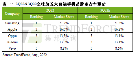 OPPO(含 realme、一加)生產(chǎn)數(shù)量為 3,880 萬部,季減 4.2%;小米(含 Redmi、POCO、黑鯊)第二季生產(chǎn)數(shù)量為 3,800 萬部,季減幅度達 14.6%;vivo(含 iQOO)因為第一季即開始大幅調(diào)整生產(chǎn)節(jié)奏,因此在第二季回升至 2,570 萬部,季增 12.7%,上述三家品牌分別位居第三名至第五名。