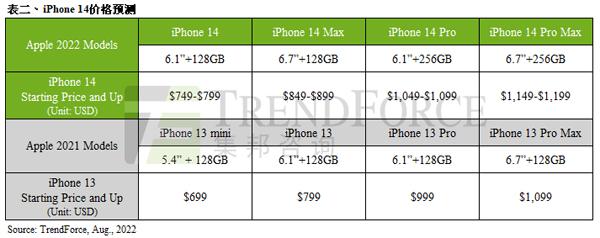第二季為蘋果新舊機種交接的過渡期,且多為年度生產(chǎn)表現(xiàn)最低的一個季度。第二季因上海、昆山等地受疫情影響,在供應(yīng)鏈補給受到?jīng)_擊的狀況下,第二季仍有 4,820 萬部的產(chǎn)出,位居全球第二。TrendForce 還預(yù)測了即將發(fā)布的 iPhone 14 系列新機的售價,稱四款新機當(dāng)中的 iPhone 14 Pro 及 Pro Max 處理器將升級至 A16(TSMC 4nm),存儲器起始容量提升至 LPDDR5 6GB 以及 256GB,主鏡頭像素增加為 4,800 萬,加上 Face ID 外觀設(shè)計變更等,預(yù)估起始定價也將隨之上揚。不過在全球高通脹以及匯差的壓力下,蘋果可望采取更謹(jǐn)慎的定價格策略以免影響銷售表現(xiàn),預(yù)估價格上漲幅度應(yīng)有機會落在 100 美元以內(nèi),售價 749 美元(約 5175.59 元人民幣)-1199 美元(約 8285.09 元人民幣)。