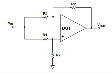 有不同的方法來測(cè)量共模抑制比。在下圖中,小編將運(yùn)算放大器配置為差分放大器的四個(gè)精密電阻。一個(gè)信號(hào)應(yīng)用于兩個(gè)輸入,測(cè)量輸出的變化,一個(gè)具有無限CMRR的放大器也沒有輸出變化。