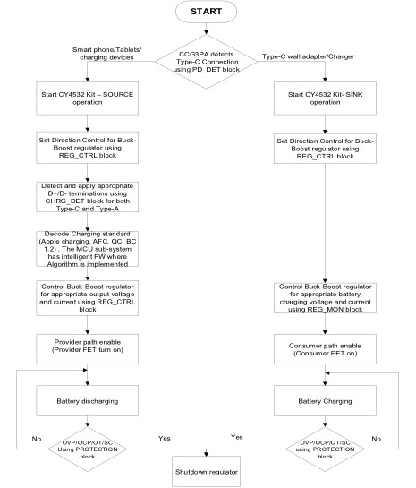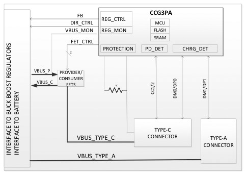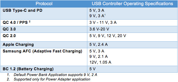 如今,可以使用專為滿足移動(dòng)電源和電源適配器應(yīng)用要求而設(shè)計(jì)的 Type-C 控制器。例如,賽普拉斯半導(dǎo)體的 EZ-PD CCG3PA 控制器支持具有可編程電源 (PPS) 模式的 USB PD 3.0 規(guī)范。該控制器還支持傳統(tǒng)的 BC1.2 和各種專有充電方法,如高通快速充電(QC)、三星自適應(yīng)快速充電 (AFC) 和 Apple 充電。