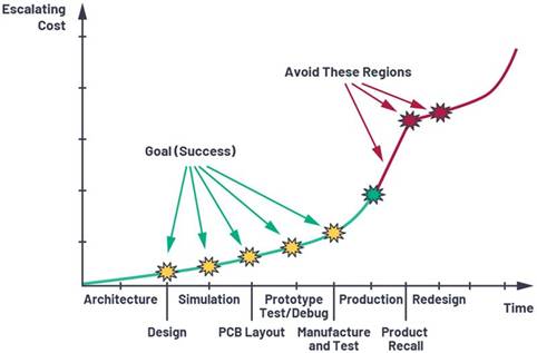 設(shè)計(jì)從圖紙上看起來(lái)可能毫無(wú)問(wèn)題(也就是說(shuō),從原理圖角度),甚至在模擬期間也沒有任何問(wèn)題,但真正的測(cè)試其實(shí)是在布局、PCB制造,以及通過(guò)載入電路實(shí)施原型制作應(yīng)力測(cè)試之后。這部分使用真實(shí)的設(shè)計(jì)示例,介紹一些技巧來(lái)幫助避開陷阱。我們將介紹幾個(gè)重要概念,以幫助避開設(shè)計(jì)缺陷和其他陷阱,以免未來(lái)需要重新設(shè)計(jì)和/或重新制作PCB。圖1顯示在沒有進(jìn)行細(xì)致測(cè)試和余量分析的情況下,在設(shè)計(jì)進(jìn)入生產(chǎn)之后會(huì)如何造成成本急速上漲。