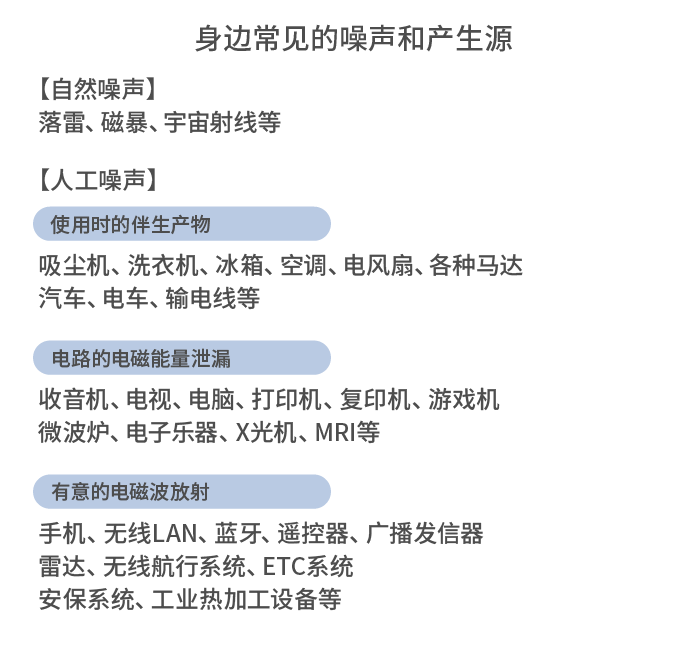 噪聲分為自然噪聲和人工噪聲。自然噪聲的產(chǎn)生源是落雷、空中放電、宇宙射線等。人工噪聲的產(chǎn)生源是電子設(shè)備。電子設(shè)備分為廣播發(fā)信器等有意發(fā)射電磁波的類型、收音機(jī)和電視等從內(nèi)部泄漏電磁能量的類型,以及電動清掃機(jī)和工具等使用時會隨之產(chǎn)生電磁波的類型。