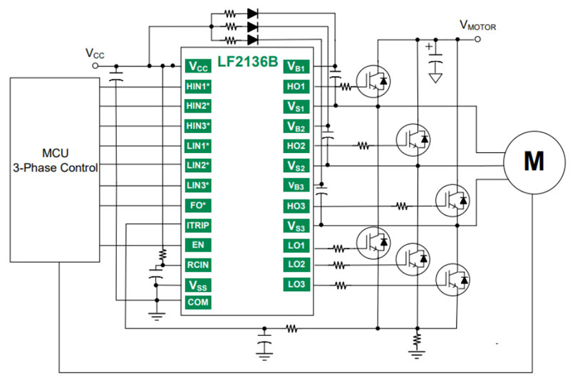 LF2136BTR是Littelfuse柵極驅(qū)動(dòng)器系列中的一款,除了LF2136BTR這種三相柵極驅(qū)動(dòng)器IC,還包括高壓高速柵極驅(qū)動(dòng)器,均具有高壓屬性,以及優(yōu)質(zhì)的驅(qū)動(dòng)特性、兼容特性和保護(hù)特性,并且都能夠在-40°C至+125°C的寬溫度范圍內(nèi)工作,可用于打造半橋柵極驅(qū)動(dòng)器、三相半橋柵極驅(qū)動(dòng)器和高側(cè)/低側(cè)柵極驅(qū)動(dòng)器。其中,半橋柵極驅(qū)動(dòng)器和高側(cè)/低側(cè)柵極驅(qū)動(dòng)器可經(jīng)過(guò)進(jìn)一步設(shè)計(jì)用于DC-DC轉(zhuǎn)換器、交流-直流逆變器電機(jī)控制、電機(jī)驅(qū)動(dòng)器、D類功率放大器等應(yīng)用;三相半橋柵極驅(qū)動(dòng)器則可以用于三相電機(jī)變頻器驅(qū)動(dòng)器、白色家電-空調(diào)、洗衣機(jī)、冰箱、工業(yè)電機(jī)逆變器-電動(dòng)工具、機(jī)器人,以及通用三相變頻器等。