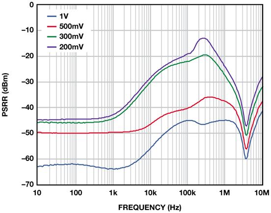 在低裕量工作模式下,需要考慮裕量電壓對PSRR的影響,否則,會導(dǎo)致輸出電壓噪聲水平高于預(yù)期。如圖3 所示的PSRR與裕量電壓關(guān)系曲線通?稍跀(shù)據(jù)手冊中找到,而且可以用來確定給定條件下可以實(shí)現(xiàn)的噪聲抑制量。