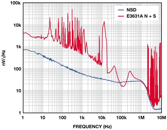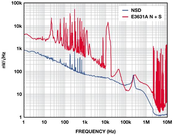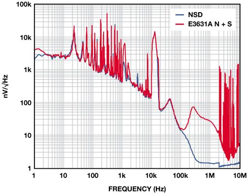 圖4 展示的是2.5 V ADM7160在500 mV裕量和100 mA負(fù)載條件下,相對于E3631A臺式電源的輸出噪聲,該臺式電源在20 Hz至20 MHz范圍內(nèi)的額定噪聲低于350 μV-rms。1 kHz以下的許多雜散為與60 Hz線路頻率整流相關(guān)的諧波。10kHz以上的寬雜散來自產(chǎn)生最終輸出電壓的DC-DC轉(zhuǎn)換器。1 MHz以上的雜散源于環(huán)境中與電源噪聲不相關(guān)的RF 源。在10Hz至100kHz范圍內(nèi),這些測試所用電源的實(shí)測噪聲為56 μVrms,含雜散為104μV。LDO抑制電源上的所有噪聲,輸出噪聲約為9 μV-rms。