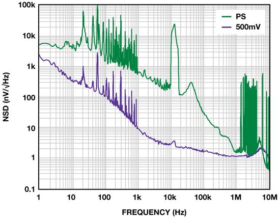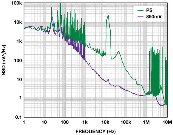 當(dāng)裕量電壓降至200 mV時(shí),隨著高頻PSRR接近0 dB,100 kHz以上的噪聲雜散開始穿過噪底。噪聲略升至10.8 μV rms。隨著裕量降至150 mV,整流諧波開始影響輸出噪聲,后者升至12μVrms。在大約250 kHz 處出現(xiàn)幅度適中的峰值,因而盡管總噪聲的增加量并不大,但敏感電路也可能受到不利影響。隨著裕量電壓進(jìn)一步下降,性能受到影響,與整流相關(guān)的雜散開始在噪聲頻譜中顯現(xiàn)出來。圖5所示為100-mV裕量條件下的輸出。噪聲已上升至12.5 μV rms。諧波所含能量極少,因此,雜散噪聲只是略有增加,為12.7 μV rms。