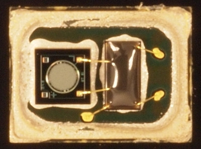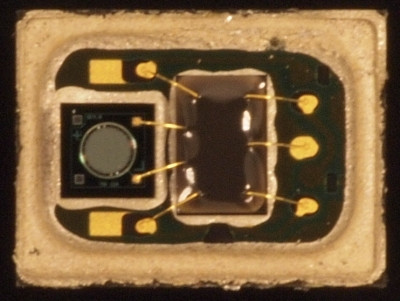 圖4和圖5分別顯示了模擬和數(shù)字MEMS麥克風的內(nèi)部細節(jié)。在這些圖片中,你可以看到左邊的換能器和右邊的ASIC(在環(huán)氧樹脂底下),兩者都安裝在疊層上。數(shù)字麥克風有額外的綁定線將來自ASIC的電氣信號連接到疊層。