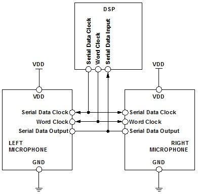I2S麥克風可以直接連接具有這種標準接口的DSP或(圖8)。與PDM麥克風一樣,兩個I2S麥克風可以連接到一條公共的數(shù)據(jù)線上,不過與PDM不同的是,I2S格式使用兩個時鐘信號——一個字時鐘和一個位時鐘。