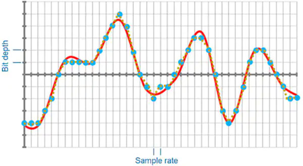圖 1:通過以既定頻率和比特率采樣進(jìn)行數(shù)字化的模擬聲音。提高采樣率和比特深度可以確保數(shù)字化的信息更接近模擬信號(hào),并提高再現(xiàn)質(zhì)量。(圖片來源:Knowles)