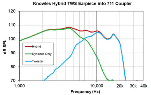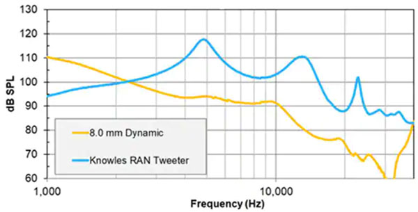 圖 7:圖中所示為 Knowles 的 BA 高音單元與動(dòng)態(tài)揚(yáng)聲器的高頻響應(yīng)比較。(圖片來源:Knowles)