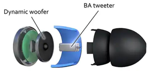 解決辦法是將低音和高音頻率分給一個(gè)動(dòng)態(tài)低音單元和一個(gè)獨(dú)立的平衡電樞 (BA) 高音單元。BA 高音單元是一種專用組件,最初是為助聽器應(yīng)用而開發(fā)的,現(xiàn)在越來越多地被用于提升高品質(zhì)耳塞的高音響應(yīng)。在 BA 高音單元中,電子信號(hào)會(huì)振動(dòng)一個(gè)微小的簧片,平衡緊湊外殼內(nèi)的兩個(gè)磁鐵。簧片的運(yùn)動(dòng)被轉(zhuǎn)移到一個(gè)非常堅(jiān)硬的鋁制振膜上,從而產(chǎn)生聲音。