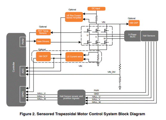 有傳感器式梯形控制不需要任何電壓或電流反饋信號(hào)即可運(yùn)行。它使用來自霍爾傳感器的位置反饋來確定為電機(jī)各相位通電的正確順序。安裝在電機(jī)上的霍爾傳感器通過轉(zhuǎn)子永磁體旋轉(zhuǎn)磁場(chǎng)產(chǎn)生的霍爾效應(yīng)來感測(cè)轉(zhuǎn)子位置。即使在啟動(dòng)時(shí),也可以進(jìn)行適當(dāng)?shù)膿Q向,因?yàn)榧词乖诹闼傧,轉(zhuǎn)子位置信息也存在。