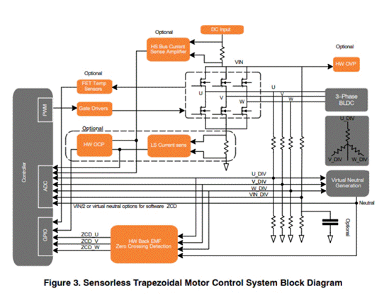 無傳感器的梯形控制使用電機(jī)旋轉(zhuǎn)產(chǎn)生的反電動(dòng)勢(shì)來確定適當(dāng)?shù)碾姍C(jī)換向順序。對(duì)于梯形控制,一次只能通電兩個(gè)電機(jī)相位。由于非通電相位中沒有電流流動(dòng),因此此時(shí)可以直接感測(cè)反電動(dòng)勢(shì)。在非通電階段,反電動(dòng)勢(shì)呈線性增加或減少。大多數(shù)用于梯形控制的反電動(dòng)勢(shì)位置反饋技術(shù)都依賴于涉及反電動(dòng)勢(shì)過零檢測(cè)(ZCD)的方法。監(jiān)測(cè)反電動(dòng)勢(shì),以確定它何時(shí)越過參考點(diǎn)——電機(jī)中性電壓或直流總線電壓的一半。