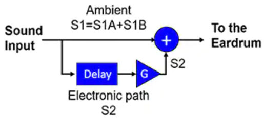 圖 4 中的變量有延遲和增益 (G)。S1 信號(hào)直接進(jìn)入耳膜。通過將環(huán)境中的 S1 聲音添加到電子 S2 路徑中,S2 中的增益功能就會(huì)產(chǎn)生一個(gè)延遲。S1 和 S2 的加入有可能產(chǎn)生回聲,但這可以通過操縱延遲時(shí)間和增益大小來減少。