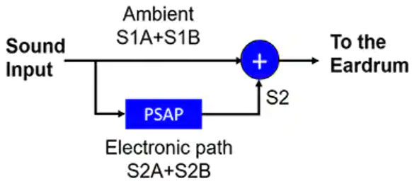 PSAP 的麥克風(fēng)捕捉環(huán)境聲音 (S2) ,DSP 對(duì)其進(jìn)行處理,輸出信號(hào) (S2A) 通過音頻換能器送入耳道。重要的是,音頻處理鏈的設(shè)計(jì)產(chǎn)生了一個(gè)延遲。這三個(gè)聲音匯集到用戶的耳膜,產(chǎn)生了 PSAP 體驗(yàn)。