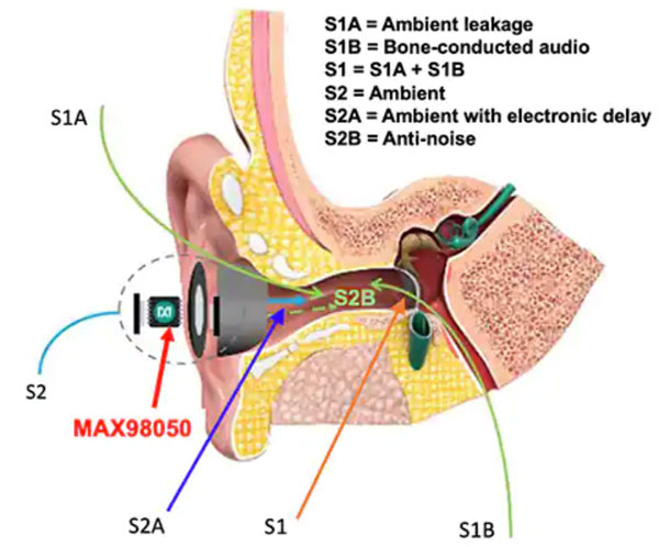 圖 3:PSAP 中到達(dá)耳膜的三個(gè)聲源:環(huán)境泄漏 (S1A)、骨傳導(dǎo) (S1B) 和經(jīng)過處理的環(huán)境聲 (S2A)。(圖片來源:Maxim Integrated,由 Bonnie Baker 修改)