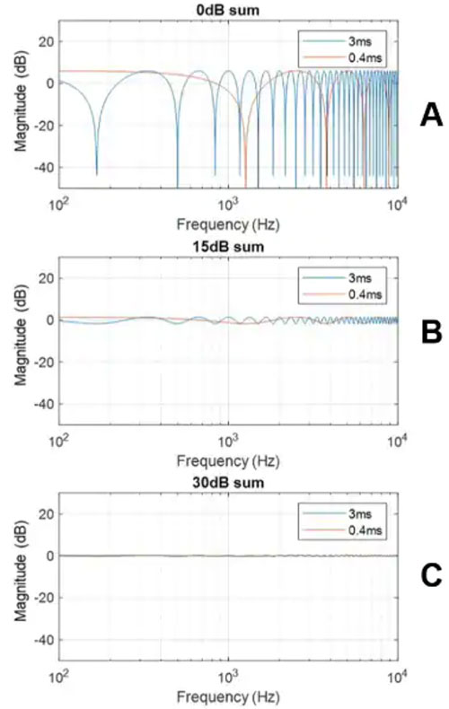 隨著圖 5B 中增益的增加,梳狀效應(yīng)的重要性在降低。從 0 dB 到 15 dB 的增益變化在 15 dB 的增益下形成了一個(gè) ~3 dB 的紋波。在圖 5C 中,在 30dB 的增益下,兩個(gè)延遲的響應(yīng)幾乎是平的。