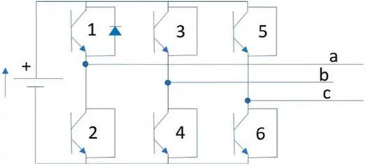 有刷直流電機(jī)使用機(jī)械換向,無刷直流電機(jī)與此不同,采用電子換向。這意味著電機(jī)的相位,根據(jù)轉(zhuǎn)子相對于定子的位置依次通電和斷電。對于三相無刷直流電機(jī),驅(qū)動器由六個電子開關(guān)(通常為晶體管)組成,通常稱為三相H 橋(圖1)。此配置允許三個雙向輸出,為電機(jī)的三相通電。