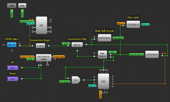 參照?qǐng)D2中GreenPAK內(nèi)部的可配置單元圖示,為了確保不丟失任何數(shù)據(jù),我們需要將SPI時(shí)鐘延遲半個(gè)時(shí)鐘周期,以便SPI功能塊在正確的時(shí)間被計(jì)時(shí)。我們通過使用CNT6、2-bit LUT1和OSC功能塊的外部時(shí)鐘來實(shí)現(xiàn)這一點(diǎn)。CNT6的輸出直到DFF0被計(jì)時(shí)后52 µs才會(huì)變高,是該SPI的SCLK周期104 µs的一半。當(dāng)CNT6為高(HIGH)時(shí),配置為與門的2-bit LUT1允許時(shí)鐘信號(hào)(CLK Begin)進(jìn)入OSC 的EXT. CLK0輸入,其輸出時(shí)鐘信號(hào)連接到CNT0的CLK端子。