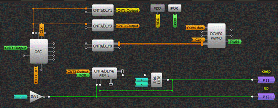 參照?qǐng)D3中GreenPAK內(nèi)部的可配置單元圖示,PWM信號(hào)是使用PWM0和相應(yīng)時(shí)鐘脈沖發(fā)生器(CNT8/DLY8)生成的。由于脈沖寬度是用戶可控的,我們使用FSM0(可以連接到PWM0)來統(tǒng)計(jì)用戶數(shù)據(jù)。