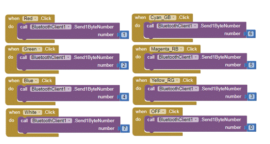在本節(jié)中,我們將創(chuàng)建一個(gè)安卓應(yīng)用程序,它將監(jiān)測(cè)和顯示用戶的控件選擇。界面由兩部分組成:第一部分包含一組具有預(yù)定義顏色的按鈕,因此當(dāng)按下這些按鈕中的任意一個(gè)時(shí),相應(yīng)顏色的LED會(huì)亮起。第二部分(MIX方塊)為用戶創(chuàng)建混合顏色。