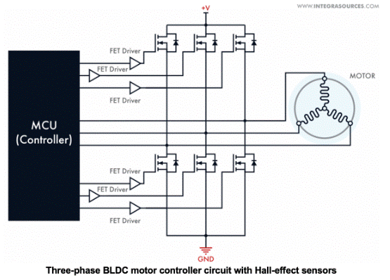 BLDC 電機(jī)控制器使用半 H 橋電路的晶體管切換電流。晶體管的數(shù)量取決于控制器激勵(lì)的相數(shù)或繞組數(shù)。三相無(wú)刷直流電機(jī)控制器(最常見的配置之一)需要三個(gè)半H橋,即每相一個(gè)高邊和一個(gè)低邊開關(guān)。