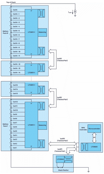 圖1.采用電池監(jiān)控器 (LTC6811-1) 和電動(dòng)汽車電池組(LTC2949) 的分布式 EV BMS 監(jiān)控拓?fù)洹?/font>