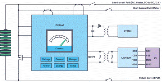 EV電池組監(jiān)視器是專為EV設(shè)計(jì)的高精度電流、電壓、溫度、電荷、功率和電能表。通過(guò)測(cè)量這些關(guān)鍵參數(shù),系統(tǒng)設(shè)計(jì)人員具備了計(jì)算整個(gè)電池組的實(shí)時(shí)SOC和SOH以及其他品質(zhì)因數(shù)的基本要素。圖 2 示出了用于高端電流檢測(cè)配置的 LTC2949 的框圖。其中,LTC2949采用可調(diào)浮動(dòng)拓?fù),使其能夠監(jiān)控非常高電壓的電池組,不受其自身14.5 V額定電壓的限制。LTC2949 的電源通過(guò)一個(gè)具有 V 的LT8301隔離式反激式轉(zhuǎn)換器提供抄送連接到電池正極。