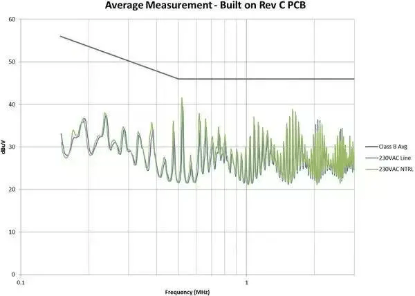 這是一條令人關注的曲線,因為它反映出了幾個問題:明顯超出了規(guī)范要求的較低頻率輻射、共模問題通常很明顯的1MHz至2MHz組件,以及較高頻率組件的衰減正弦(x)/x分布。需要采取措施讓輻射不超出規(guī)范。我們利用通用電容公式將其降低了: