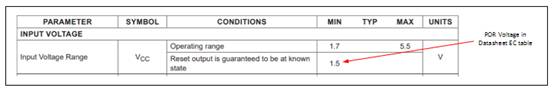 上電期間,如果電源電壓低于VPOR,就沒有足夠的電壓能驅(qū)動內(nèi)部MOSFET工作,因此MOSFET關(guān)閉。此時,監(jiān)控器無法對復(fù)位電壓進行控制。復(fù)位電壓將與上拉電壓(VPULLUP)成比例上升。而一旦電源電壓高于VPOR,內(nèi)部MOSFET將驅(qū)動RESET引腳進入有效狀態(tài)。
