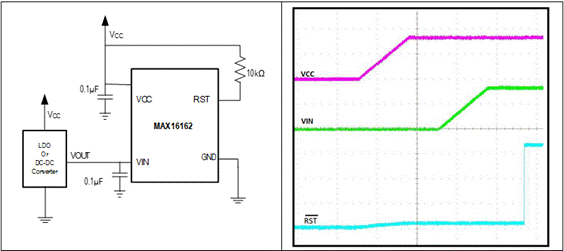 真正的無毛刺監(jiān)控器可以通過復(fù)位吸入電流,即使當(dāng)VCC為零時也會將復(fù)位引腳強制拉到接地電位。圖6顯示了一種真正無毛刺監(jiān)控器的示例電路。ADI的MAX16161/MAX16162無需任何外部組件即可實現(xiàn)無毛刺工作,小巧且經(jīng)濟。