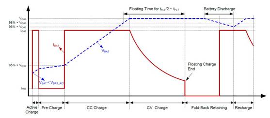 除常規(guī)的預充電、恒流充電、恒壓充電階段外,SGM41566 還具有特殊設(shè)計的深度放電電池激活充電功能 (Active Charge) 和在電池充滿后的安全電壓回退功能 (Fold-Back Retaining)。當電池電壓低于深度放電激活檢測門限時,SGM41566 會以恒流充電電流 ICHG 給電池充電 12.5ms,以快速激活電池,此后會自動進入預充電階段。滿電安全電壓回退功能則對延長長期掛載設(shè)備的電池壽命有極大的幫助。
