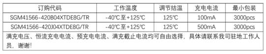 SGM41566 具有完整的預充電、恒流充電、恒壓充電流程,各階段充電電流均可方便選擇。恒流充電電流 ICHG 在 50mA 至 750mA 范圍內(nèi) 50mA 步進可選;預充電電流和滿充截止電流在 5%ICHG 至 25%ICHG 范圍內(nèi) 5%ICHG 步進可選,且具有無預充功能 (No Pre-Charge) 選項來滿足部分電池低壓階段的大電流充電需求。滿充電壓在 3.5V 至 4.8V 范圍內(nèi) 25mV 步進可選,可方便的適用于磷酸鐵鋰電池、錳鋅電池、鋰離子電池、3 節(jié)/4 節(jié)鎳氫電池的電子設(shè)備。