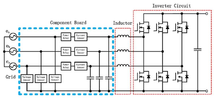 組件板,基于九個(gè)三相電容器(B32774D8126K000,12 μF)、三個(gè)電壓傳感器(RP1215D)、三個(gè)電流傳感器(CKSR 25-NP)和三個(gè)功率繼電器(T9SV1K15-12)