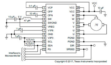 The DRV10987 device uses a proprietary sensorless control scheme to provide continuous sinusoidal drive,which significantly reduces the pure tone acoustics that typically occur as a result of commutation. The interfaceto the device is designed to be simple and flexible. The motor can be controlled directly through PWM, analog, orI2C inputs. Motor speed feedback is available through both the FG pin and the I2C interface simultaneously.