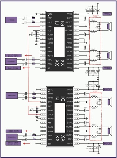 3、IU5706支持12V升壓至24V,給兩顆IU8689供電,輸出4x65W/4歐 ( THD+N=1%);IU8689主從模式可實現(xiàn)多顆芯片無限級聯(lián)功率輸出,此應用非常適合車載音頻后裝市場。