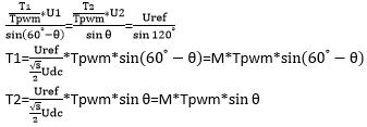 圖4為參考電壓在第一扇區(qū),有兩個(gè)非零矢量U1U2和零矢量合成,當(dāng)參考電壓進(jìn)入下一個(gè)扇區(qū),采用新的相鄰兩個(gè)矢量與零矢量進(jìn)行合成;谑噶亢铣梢(guī)則,在符合T1+T2 《= Tpwm條件下,并要求任意角度下V1和V2都能合成出的矢量,所以Uref_max=√3/2 Udc。調(diào)制度M=Uref/(Uref_max)=Uref/(√3/2 Udc)。