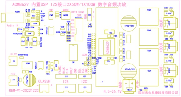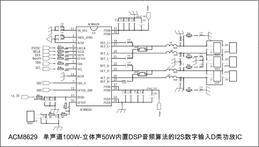 | ACM8629 單聲道100W/立體聲50W內(nèi)置DSP音頻算法的I2S數(shù)字輸入D類功放IC解決方案 |