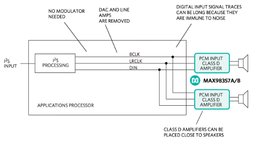 由于其高效率和出色的EMI性能,無濾波器數(shù)字輸入D類放大器已成為消費(fèi)電子設(shè)備中驅(qū)動(dòng)揚(yáng)聲器的公認(rèn)標(biāo)準(zhǔn)。這是因?yàn)樗鼈儾皇芘c模擬對應(yīng)物相關(guān)的電路板設(shè)計(jì)問題的影響,最具體地說是信號完整性。單通道數(shù)字D類放大器可以放置在電路板上的遠(yuǎn)程位置,以最大限度地減少大電流電池和揚(yáng)聲器負(fù)載連接的布線。這些放大器不需要模擬輸入D類設(shè)計(jì)所需的DAC和線路驅(qū)動(dòng)器。因此,空間和系統(tǒng)成本下降,設(shè)計(jì)變得更加簡單。許多D類放大器接受脈沖編碼調(diào)制(PCM)或I類放大器2需要三根導(dǎo)線的 S 數(shù)據(jù):BCLK、LRCLK 和 DIN(圖 2)。PCM 數(shù)據(jù)格式不需要調(diào)制器或應(yīng)用處理器上數(shù)據(jù)的上采樣來提供立體聲數(shù)據(jù)。