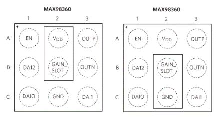 該 IC 還具有其他一些顯著優(yōu)勢,有助于最大限度地減小電路板尺寸/成本。首先,它有1.9毫米的微小尺寸。29 引腳 WLP 具有巧妙的引腳布局,旨在消除對昂貴電路板過孔的需求。如圖4所示,GAIN_SLOT引腳(位于封裝中心)可以方便地連接到VDD或 GND(直接或使用電阻器)或保持未連接狀態(tài),以提供 I2S/左對齊增益設(shè)置如表1所示。