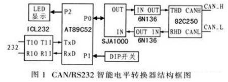 由于PC機(jī)無CAN接口,因此,PC機(jī)與智能節(jié)點(diǎn)構(gòu)成CAN總線系統(tǒng)可采用RS232/CAN、并口/CAN、USB/CAN、ISA卡/CAN以及PCI卡/CAN方式接入。而采用RS232/CAN接入時(shí),需采用CAN/RS232接口標(biāo)準(zhǔn)轉(zhuǎn)換。針對(duì)這一問題,提出了CAN/RS232智能電平轉(zhuǎn)換器設(shè)計(jì)方案,以SJAl000作為獨(dú)立CAN控制器,完成CAN通信協(xié)議。并在SJAl000與驅(qū)動(dòng)器之間連接高速光耦,從而實(shí)現(xiàn)總線各點(diǎn)間的電氣隔離。